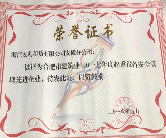 合肥市建筑業2017年度起重設備安全管理先進企業頒發機關:合肥市建筑工程協會